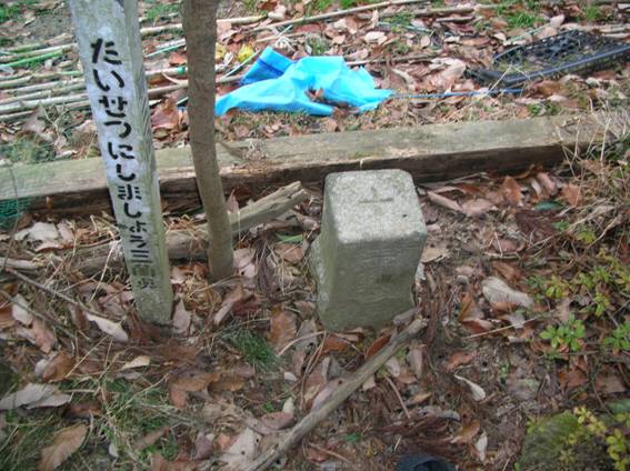 国道419号から小原村市街地を過ぎたところで、右折して県道354号線に入る。さらに丸一商店の前で右折して、「蚕霊神社」を目指して登っていく。坂を登り切ったところの三叉路を右折する。さらに登っていくと左手に入る道がある。ここにも「蚕霊神社」の看板がある。これを登っていくと駐車場へ着く。ここが蚕霊神社である。16時09分に境内へ入っていくと、広場と休憩舎がある。そして、右手上に本殿がある。この本殿に向かって左手を奥へと進むと、赤い鳥居があり、その奥に石塔が2つある。この石塔と石塔の間に三角点がある。16時11分に着く。この三角点も不思議な場所にある。16時14分に駐車場へ戻った。