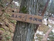 13時59分に三角点を出発し、14時00分にピークを越えて下り、14時03分に四辻を右へ下り、14時04分にV字カーブを右へ曲がって、右山でトラバースし、14時09分に「牛洞坂まで740m」の道標を、14時13分に「牛洞坂まで560m」の道標を、14時13分にピークを越えて、14時15分に「見晴らしコース」の分岐を通過した。さらに14時16分に「牛洞坂まで360m」の道標を越えて、14時17分にピークを通過し、14時19分に「牛洞坂まで140m」の道標を、14時20分に「牛洞坂まで50m」の道標を通過して、14時21分に牛洞坂の駐車地点に下り立ったのであった。