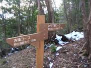 13時45分に遊歩道は横V字型にUターンする。戻り気味に坂を上ると、尾根に出て、ここは四辻になっている。