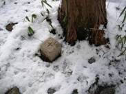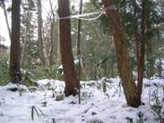 「とりで跡コース花立峠まで300m」「とりで跡コース 牛洞坂まで800m」という道標がある。ならば、この付近に三角点があるはずだと探した。ちょうど積雪があり、立入禁止となっている方へ足跡があったので、13時55分にそれをたどると、わずかに下がった平地に2本の松があり、その根元に三角点があった。13時56分に四等三角点「点名:小洞」(229.0m)を発見したのであった。とにかく発見できてよかった。