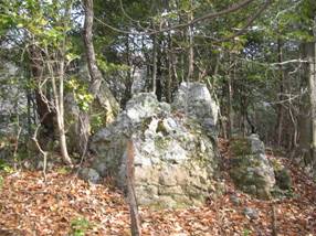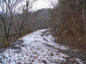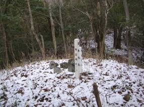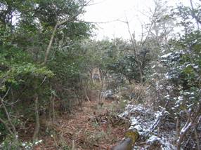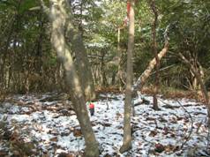 9時03分に出発した。尾根を目指して道なき薮を登っていくと、南側(右側)の斜面が削ってあり、そこは薮がないので、削った斜面を登っていくが、昨夜来の積雪があり、衣服が濡れてしまった。すぐに疎林の中へ入り、尾根を外さないように登っていくと、9時12分に大岩のあるピークに出た。ここでやや右手へと曲がる。