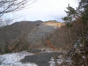 9時53分に出発し、このまま尾根を登って、雁又山まで行こうとした。10時05分に採石場の作業道がヘアピンカーブとなっている場所に出た。作業道へ出ずに、尾根をこのまま登ろうとしたが、採石場へ出てしまうので、あきらめて10時09分に作業道へ下り立った。作業道を上部へと上がっていくと、これまた採石場へ出てしまい、採石場では重機の音が聞こえていたので危ないと思い、10時13分には作業道を終点から引き返して、下っていった。すると、正面に雁又山が見えてきたが、これを見ると、どうしても採石場の中を通らないと行けないように見えた。それで、このルートをあきらめて、往路を下山し、雁又山へは金尾滝から登ろうと考えた。引き換えして、10時17分には作業道から尾根に入った。