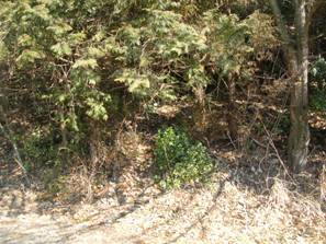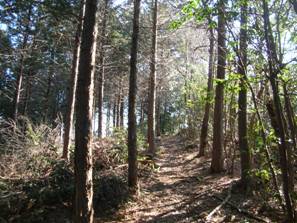 9時45分に出発した。予想通り登山道も踏み跡もない。薮を掻き分けて、9時58分に尾根に出た。尾根には多少の踏み跡がありそうである。しかし、全く薮ばかりという箇所もある。10字07分には左が植林、右が雑木の境に踏み跡のようなものがある尾根に差し掛かった。そして、10時13分にピークに出た。いったん傾斜は緩むが、また急斜面になる。がまんして登っていくと、10時28分に切り開きの道に飛び出した。
