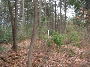 ここから少しだけ下りがあり、やがて、9時32分には平らな場所に出て、右手にヒノキの植林が現れた。左は雑木林であり、この境を進んでいくと、やがて斜面となり傾斜もきつくなるが、がまんして登っていく。距離はあまり長くはなく、9時39分には三角点の標柱が見えてきた。