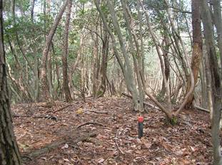 11時30分に出発、入山した。この山(?)も登山道はなく、最初から激薮かつ急傾斜であった。木の枝や根っこをつかみ、両手両足を使ってよじ登る。すると、11時44分にいきなり鉄塔に飛び出した。なんだ。鉄塔があるなら、その巡視路があるはずだが、それを探しても結局見つからなかった。ただ、東側に見える鉄塔への巡視路はあった。あとから気づいたのであるが、駐車地点からさらに東へ走ったところに鉄塔巡視路の案内板があったので、巡視路はそこから入山して、この鉄塔まで続いているのであろう。それで、当然ながらこの鉄塔から先は巡視路はないのである。尾根を忠実に登って行き、尾根が狭まってくると、疎林となり歩きやすくなってきた。