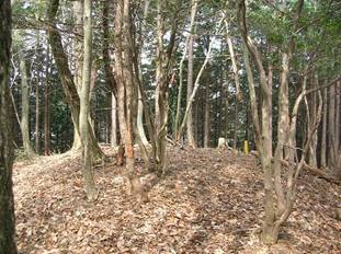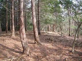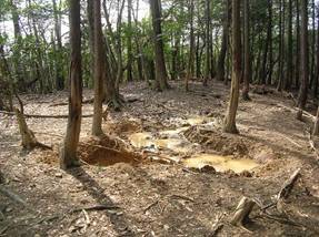右折すると地形図では細い平坦なまっすぐの尾根になっているが、左は植林で右は雑木の境界尾根を進んでいく。途中、明るくなったところがあり、そこには「ヌタ場」があった。