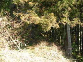 「点名:苦桃」は、登山道はない。地形図から距離が短くて、楽そうなルートを探し、県道79号線の鹿穴峠から岐阜市側へすこし下ったところから取り付くことにした。ここには、谷があり、旧道と思われる廃道がある。この旧道と新道の合流点に駐車した。旧道に車の頭を突っ込んでもよいが、草が茂っているので路肩に駐車した。かろうじて路側帯ラインの外側に収まった。