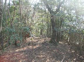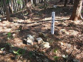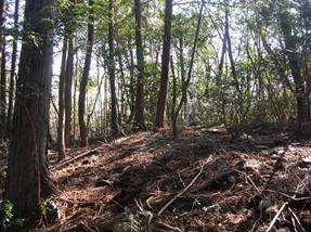 9時48分に下山した。9時51分には市境尾根から左へ曲がって、9時54分にピークAを通過し、9時55分にピーク@を越えた。9時57分には稜線の先端に達した。このまま踏み跡のようなものが伸びていたが、どこへ続いているかわからないので、往路を下って、10時02分に駐車地点に戻った。