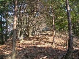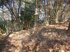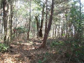 道はないので左手の尾根を目指して、直登していった。間伐のためか木が切ってあるが、そのまま放置してあるので歩きにくい。倒木を乗り越えたり、避けたりしながら、8時15分に尾根に乗った。この尾根は右手は植林、左手は雑木である。尾根に乗ると多少は歩きやすくなってきた。