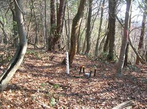 8時38分に到着した。三角点は最高点にはなく、おかしいな?と付近をキョロキョロすると、最高点から南側(右側)へ少し下がったところに標柱が見え、三角点があった。「点名:明谷(299.5m)」である。