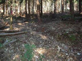 樹林のため展望はなく、8時44分には下山した。手前のピークを8時47分に通過し、8時48分には稜線から左へ下る場所に着いた。尾根を下ってくると、作業道を発見した。