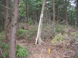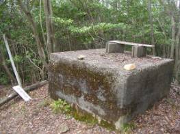 この左へ90度まがる場所には「監視硝跡」という立て札があり、12時16分に着いた。ここにはちょっとした広場と四角いコンクリートの台とその上にベンチのようなものがあった。何を監視したのか?戦時中のものか?他に説明版もなにもないのでさっぱりわからない。さらに進んでいくと、ほとんど平坦地であるが、それでも12時24分にはピークのようなコブを越えるが、そこには「〇1番」の立て札があった。