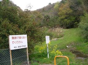 ここから沢に沿って下ると、12時59分に本巣小学校の東門のところに出た。この登り口には土石流危険渓流「月洞谷」という看板が立ててあった。