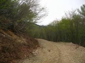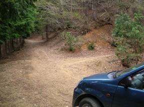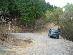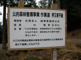 滋賀県へ行っての帰り道、関ヶ原町から「明神の森」の案内に従って、林道へ入り、くねくねの林道を上がって行く。そして、明神の森の管理棟や駐車場を過ぎ、さらに進むと、アンテナ塔や神社への分岐を通り越すと、林道は下りとなり、揖斐川町春日(旧春日村)への道と、明神池田線(池田山へ続く道)との分岐点に出る。ここで、右へ曲がって、池田山へと尾根上の林道を北東へ進む。林道が大きく右へペアピンカーブする手前に左へ入る林道がある。この林道は、落ちている看板によると、「押又東谷作業道」というようだ。