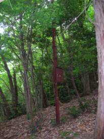 15時07分に壊れた電柱?がある場所に出た。そして、15時09分に山頂に到着した。四等三角点「点名:木曽屋(327.5m)」山頂には倒壊したサイレン塔のようなものがあった。それで、あの電柱はここへ電気を送るためのものであったのかと思った。山頂は平坦になっているが、周囲は樹林で展望はない。