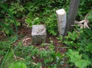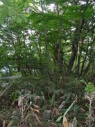 笹と藪の中にたたずんでいた。このピークの一番笹と藪の深い場所にあったのだ。ピークの平らの北東の位置にあった。地形図の三角点はピークの平らの東寄りに記してあるので、よけいに見付けにくいのであった。ここから寺師山(点名:寺師)へと向かう尾根道(道か?)の左手にある。