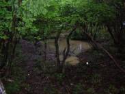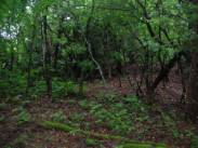 遊歩道から分岐すると、薮になるが、踏み跡程度はある。尾根を外れないように下ってさらに登っていくことになる。少し下った11時39分にはヌタ場があった。