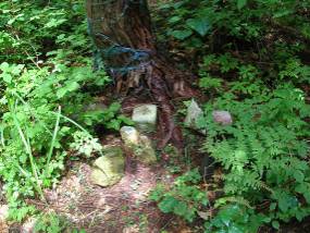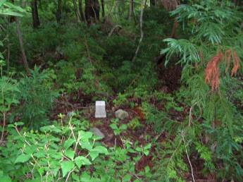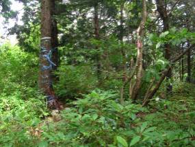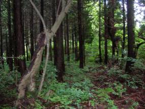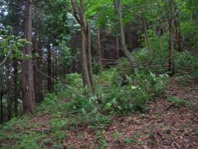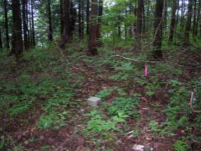 時刻は、12時38分であった。修理は樹林に囲まれ、平坦地なので展望はない。まだ、先があるので、12時43分にはここを出発した。いったん緩やかに下っていく。これも幅広の尾根なので、方向を見失いがちになる。しかし、足下の踏み跡はいままでよりも明瞭である。植林の中なので雑草が生えないからであろうか。地形図でみる限り東側(左手)が急斜面なので、左寄りを進んでいった。下る途中の12時40分には、造林公社の「NO.094」の杭があった。そして、12時53分にはいったんピークのような場所に出て、ここには「NO.106」の杭があり、さらにその先下りになることころ、12時58分に「NO.114」の杭があった。そして、右植林、左雑木の境界を下り、13時04分に鞍部を通過して、今度は、登りに転じる。この先に三角点があるはずだ。13時20分に点名:大見(505.7m)の三角点の場所に出た。この三角点は檜の木の根本にあった。三角点のすぐ横から檜が大きくなったというべきか。檜がかわいそうというべきか、三角点がかわいそうというべきか。周囲は樹林で展望はない。