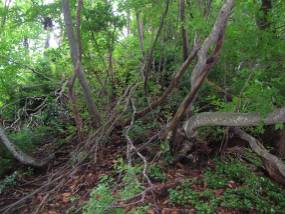 まあ、それはともかく、11時前にはこのトンネルを東から西へ抜けることができた。西側に駐車できる広場があるので、ここに駐車した。登山口を探したが、そんなものあろうはずがない。草も生い茂り、踏み跡や獣道も班別できない。