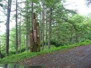 ガスのため展望はなかったが、本当に気持ちがいいので、ゆっくりと昼寝でもしていたい気分であった。名残惜しいが下山して、今度は鉢伏山(1,928m)の登山口を確認しようとスカイラインを奥の方へと進んだ。約15分車で走ると、鉢伏山(1,928m)の登山口があるらしい。そこは、優良駐車場と有料トイレがあるように案内図にはなっている。その鉢伏山の登山口へ行く途中に「崖の湯温泉」への分岐があった。この分岐三叉路には広場があって、車はいくらでも駐車出来る。ここに駐車して歩いて鉢伏山へ登ることも出来る。鉢伏山登山口の方には、「鉢伏山まで6km」という道標があった。林道なら6kmといってもそんなに苦痛ではなかろう。そのうち、山道がどれくらいあるのかはわからないが。この地点の標高がすでに1,500mか1,600mなのであるから、鉢伏山山頂まで標高差は300〜400mしかない。まあ、鉢伏山は次回にして、ここから「崖の湯温泉」の方へ下った。