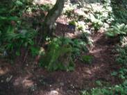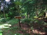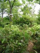 ここから山頂へはいったん「本堂跡」へ戻り、「本堂跡」を左に見て、そのまま進む。一段下の平坦地に下りる。