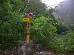約1時間歩いて、5時36分に林道の終点(西俣出合)に着いた。ここから茶房堰堤の下にあるトンネルを抜けて、右岸へと渡る。右岸へ渡ると、そこから登山道が始まる。すぐに「西俣出合」の標柱があった。