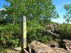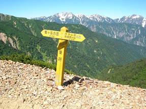 7時35分に「高千穂平」(2,049m)という標柱のある平坦地に飛び出した。ここからは一気に展望が開ける。目の前には「鹿島槍ヶ岳」がそびえている。しかし、暑さのため水を多量に消費した。ここまでに1.2gを飲み干した。水分は4gを背負っていたが、この分では冷池山荘で水を補給しなければいけないかな?と思った。