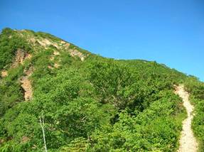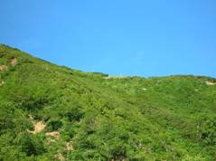 そんなことを考えながら、7時50分にここを出発、「冷乗越」を目指す。展望は開けているが、やせ尾根であり、崩落した場所やクサリのある場所もあり、緊張を強いられる。8時34分に標高2,278mのコブを通過し、9時07分にやっと「冷乗越」に出た。