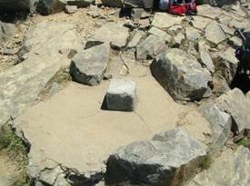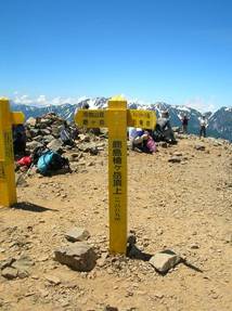 そして、11時17分にようやく鹿島槍ヶ岳山頂(南峰:2,889m)に着いた。水は更に0.5gを消費した。登ってくる途中では、北峰まで行こうかと考えていたが、この南峰へ着いたときには、北峰まで足を延ばすだけの体力と気力が失せていた。それで、北峰は諦め、大休止となった。天気がよく、素晴らしい展望である。登山道からは見えていた富士山は雲に隠れてしまっていた。しかし、五竜岳、唐松岳、白馬岳、剱岳、立山、爺ヶ岳、針ノ木岳、蓮華岳、北アルプス、南アルプス、八ヶ岳、火打山、妙高山、高妻山など、快晴の空に見えていた。