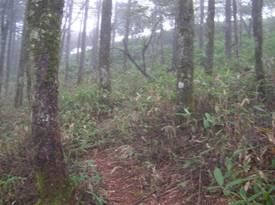 登山口は分からないので、それらしい場所はないかと探しながら車を走らせる。霧が深いので慎重になる。中山道の標識はあるが、どうも納得できない。ここから入山すると歩く距離が長すぎる。そうこうしていると、「三峰駐車場」があったが、霧が濃くて駐車場に入るのを逸してしまった。それからしばらく走ったが、扉峠の手前でUターンして「三峰駐車場」まで戻ってきた。駐車場内に案内図があったが、登山口は表示してない。付近を探して、地形図と照らし合わせると、どうしてもこの駐車場の反対側(ビーナスラインを渡った所)から登山道がありそうだ。たしかに道路から登り口があったので、その道を登ってみようとした。