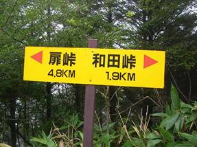 このトレイルを左へ進む。少しの登りでコブに出る。ここに「和田峠1.9km、扉峠4.8km」という道標があった。合計で6.7kmか、縦走に丁度いい距離だな。八島湿原から和田峠までは5kmだし、結構、いい時間設定や距離設定になっている。和田峠には待機車両用の広い駐車場もあった。参加者が多ければマイクロバスを借り切って来るのもよかろう。