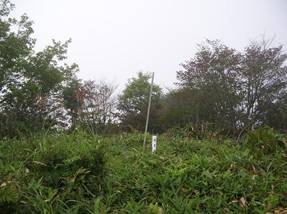さて、三角点は?周りを見回すと、右手の高みの薮の中にポールが見えた。あれに違いないと笹を分けて登って見ると、あった!!笹の中に三角点と白い標柱が。13時07分に三角点(点名:東餅屋)を発見。ここは樹林のため展望はない。13時09分に下山し、13時10分にコブへ下りて、13時12分にはトレイルから外れ、13時13分に車に戻った。