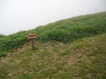 早速、準備をして12時10分に出発した。相変わらず霧が深い。しかし、こんな場所では迷うこともあるまい。実際、木々はなく一面の笹原であり、その中に笹を刈った広い登山道があるのだ。