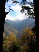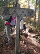 木曽駒ケ岳、宝剣岳の展望が素晴らしいのであるが、木曽駒ケ岳の山頂はガスがかかり、宝剣岳の山頂がわずかに見えていた。宝剣岳と三の沢岳の間の沢筋の紅葉はきれいであった。山頂付近は白い雪が見えた。絶景を楽しみつつ、我々もここで食事休憩として、めいめいに食事をとった。この展望地は樹林に囲まれているため、日差しが薄く寒くなってきた。11時59分には下山にとりかかった。12時04分に風越山山頂まで戻り、写真を撮って、12時09分にここを出発し、12時10分と、12時19分にそれぞれ「敬神」への分岐を通過し、12時21分に「風越の頭」に着いた。