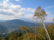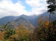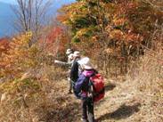 12時36分にここからカヤの草原を急降下していく。12時40分にも同じような道標を通過し、やがて、雑木林に入って行くが、こちらの雑木林はAコースよりも疎林の感じで、雰囲気がよい。紅葉もきれいである。12時46分に「林道←風越山登山道→頂上 ハッピャクガリ」という道標のある場所に下り立った。御岳山の展望がすばらしい。