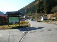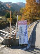 途中、「ヘブンス園原」や「野熊の床 月川(げっせん)」や「パークランド」の分岐があるが、右左折はぜず、いづれも直進する。そして、集落の終わるころ、恵那山登山道広河原コースの登山者用の案内看板がある三叉路がある。これによると、「この林道は通行止めであるが、恵那山の広河原コースの登山者は、この林道を進んで先にあるゲートまで車で入り、そのゲートの手前横にある臨時無料駐車場に駐車して登山口まで歩いてください(ゲートから登山口まで約2km、徒歩30分)。」となっている。