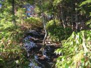 登山口からは、左下に流れる本谷川の左岸に下り、丸太橋を渡って右岸側へ出る。右岸側に渡ると、川下に下るように登山道が付けられている。初めは緩やかに登っていくと、風穴への分岐(6:12)がある。