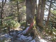 さて、1時間の大休止の後、どんどん登山者が登ってくる中、いよいよ避難小屋から下山(10:31)にとりかかった。軽く登って、三角点や展望台ののある山頂(10:39)を通過し、まだ積雪のある登山道を下り、コブ(10:42)を乗り越えて、登りには気づかなかった「9/10」の表示(10:52)を過ぎると、すぐに県境尾根からの下降点(10:57)であった。あとは休憩もなく、「7/10」地点(11:20)、「6/10」地点(11:34)、「5/10」地点(11:45)をそれぞれ通過した。そして、「恵那山」の道標(11:49)のある地点まで下ってきた。さらに、「3/10」地点(12:00)を過ぎて、平らな場所(12:04)も過ぎ、「2/10」地点(12:08)を通過して、尾根から離れ(12:14)トラバース道になると、やがて、風穴の分岐点(12:21)に出る。そして、橋を渡り登山口の林道()12:26へ出た。