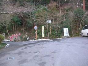 登山口への分岐の林道は、車でも入れないことは無かったが5分くらいならばと、この分岐の広場に駐車して歩くことにした。14時25分に出発した。未舗装の林道を歩いていくと、14時27分に登山口の看板が見えてきた。