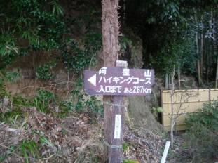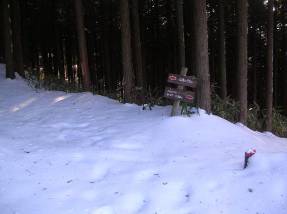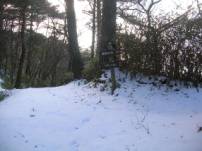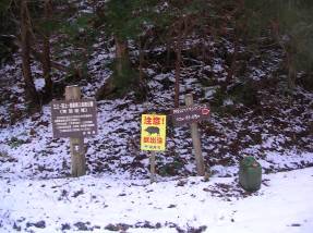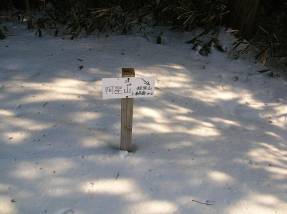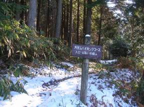 その交差点に「阿星山ハイキングコース入口まで徒歩で約5分」という看板があった。行きにはこの看板に気づかず、さらに舗装林道を上がっていく羽目になった。上部に行くにつれて積雪も多くなり、路肩の木々が倒れかかったりしており注意して通行したが結局、土砂崩れで通行不能となりUターンして、登山口を探しながら林道を戻り、上記の分岐に来たのである。
