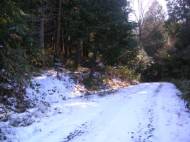 突き当たりの右手が長寿寺であるが、左手に林道が続いているのでこの林道に入る。積雪があるが構わずどんどん上がって行く。舗装された林道を上がっていくと、長寿寺から2.9kmくらい上がった所に駐車場のような広場があり、そこから未舗装の林道が分岐している。