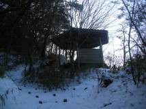 「阿星山ハイキングコース 山頂まで約40分」となっている。事前に入手した情報どおりである。ここから林道を離れ階段の登山道を登ると、14時33分に「阿星山頂あと25分」という看板があった。しかし、積雪は増えてきて、20cmほどになってきた。それでも構わず、階段の登山道を登っていくと、14時39分にベンチがある場所に出て、すぐ先には休憩所(展望所)があった。