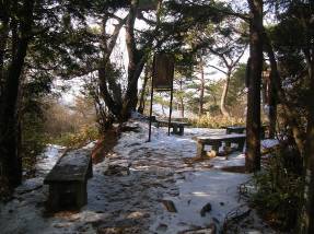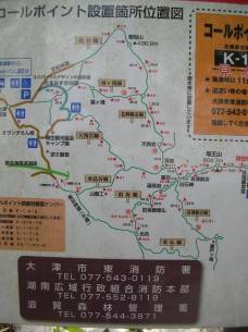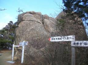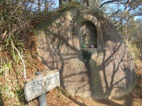 また往路を戻らなければならないので、12時43分に下山した。あとは、ひたすら戻るだけだったが、なかなか足がついてこない。12時47分にコールポイント「K5」を、12時52分にコールポイント「K6」を、12時59分にコールポイント「K7」を通過したが、途中、まだ、天狗岩の随分手前なのに、上述の単独行に追い越されてしまった。そして、13時03分にコールポイント「K8」を、13時12分にコールポイント「K9」を、それぞれ通過し、13時19分に天狗岩の直下に着いた。コールポイント「K10」である。追い抜いて行った例の単独行が、ベンチで待っていてくれた。コーヒーをごちそうになった。しかし、ゆっくりもしていられないので、13時24分には単独行と分かれ、ここを出発した。あとは、13時32分に耳岩を、13時37分にコールポイント「K12」を、それぞれ通過し、13時40分に白石峰の四つ辻に出た。ここを13時42分に出発し、13時43分に「茶沸観音」を過ぎ、13時47分にピークを越え、13時51分にコールポイント「K15」のピークを越え、13時54分に「竜王山」へ来た。さらに13時58分にコールポイント「K16」を通過して、14時03分に金勝山ハイキングコースの入口に出た。往路では1台もなかったのに、駐車場には5台〜6台の車が駐車してあった。さすがに人気の山なのであろう。