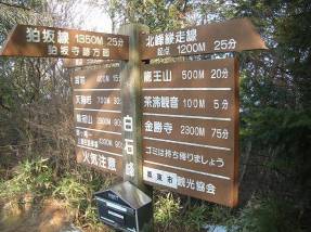 11時10分にここを出発し、左手の高みへ登ると、そこが竜王山(604.7m)であった。11時11分に到着である。樹林が邪魔をして展望はあまりよくない。11時14分にここを出発した。いったん下ってから、擬木の階段を上がると、11時21分にピークに出た。ここはコールポイント「K15」でもある。そして、尾根伝いに進んで、11時25分に「茶沸観音」を通過し、11時27分に白石峰の四つ辻に出た。