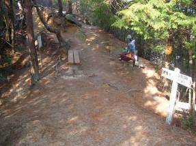 すぐにピークに出て、下りとなる。痩せ尾根を通り、擬木の階段を登ると、「K16」というコールポイントがあった。ここからまた痩せ尾根をとおり、擬木の階段を登ると、11時07分に金勝寺八大竜王本殿に出た。