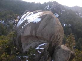 11時50分に天狗岩の岩上に立った。岩上は案外広くて2組が昼食中であった。それだけ広いということだ。多くの登山者は思い思いの岩の上で休憩している。大きな岩が林立しているのである。どれが天狗岩なのか分からない。あるいは、これらを総称して天狗岩と呼んでいるのであろう。展望はすららしいことは言うまでもない。これから向かう鶏冠山も目の前に見える。
