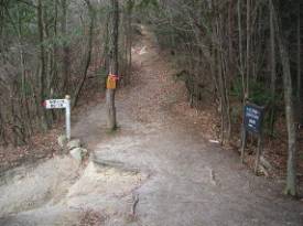ここは多くの登山者が交錯するにぎやかな場所のようだ。案内看板も賑やかである。ここには「北峰縦走線終点3500m90分」「耳岩400m15分」「天狗岩700m30分」「鶏冠山2900m90分」「落ヶ滝〜上桐生駐車場4300m90分」「北峰縦走線起点1200m25分」「竜王山500m20分」「茶沸観音100m5分」「金勝寺2300m75分」という道標がある。先は長いので、11時30分にここを出発した。11時34分にコールポイント「K12」を通過し、11時37分に「耳岩」の分岐に出た。