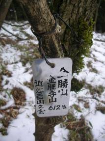 ここに間違いないと確信し、写真を撮ろうとしたら、なんと枯れ木に「金勝寺山」の山名板が取り付けてあった。それも3枚も。