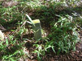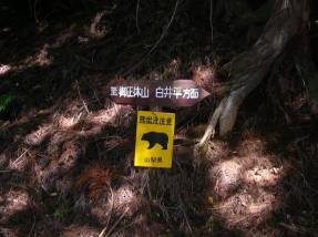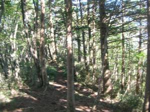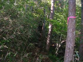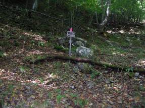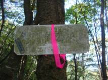 13時34分には下山にかかった。往路をピストンである。13時39分に「九合目」を、13時44分に「八合目」を通過したが、「七合目」の杭は見落とし、13時50分に主尾根からの分岐点に下り立った。ここから右山でトラバースして、13時52分に支尾根に移った。支尾根を下って、13時53分に「六合目」を、13時58分に「五合目」を通過した。そして、「四合目」の手前で登って来るパーチィに出会ったが、「この時間から登るのか?」と不安に思った。そして、尾根からトラバース道へ入ると、14時03分に「四合目」の杭を通過した。14時05分に沢沿いの道に下り立った。沢の右岸沿いを下り、14時10分に2つの沢の間の尾根道へ移り、14時13分には2つの沢から離れて、14時15分に登山口の林道終点に出た。あとは、林道を歩いて、14時18分に駐車地点へ戻った。下りは、44分であった。