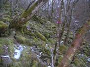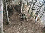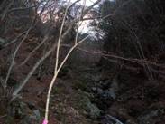 7時08分に沢沿いに出た。しばらく沢の右岸側を登って、7時11分にこの沢を渡る。ちょうど沢が二股に分かれている場所である。分かれている沢を2つとも渡る。そして、しばらく植林の中を登ると、7時26分に「ヲイ平」という場所に出た。